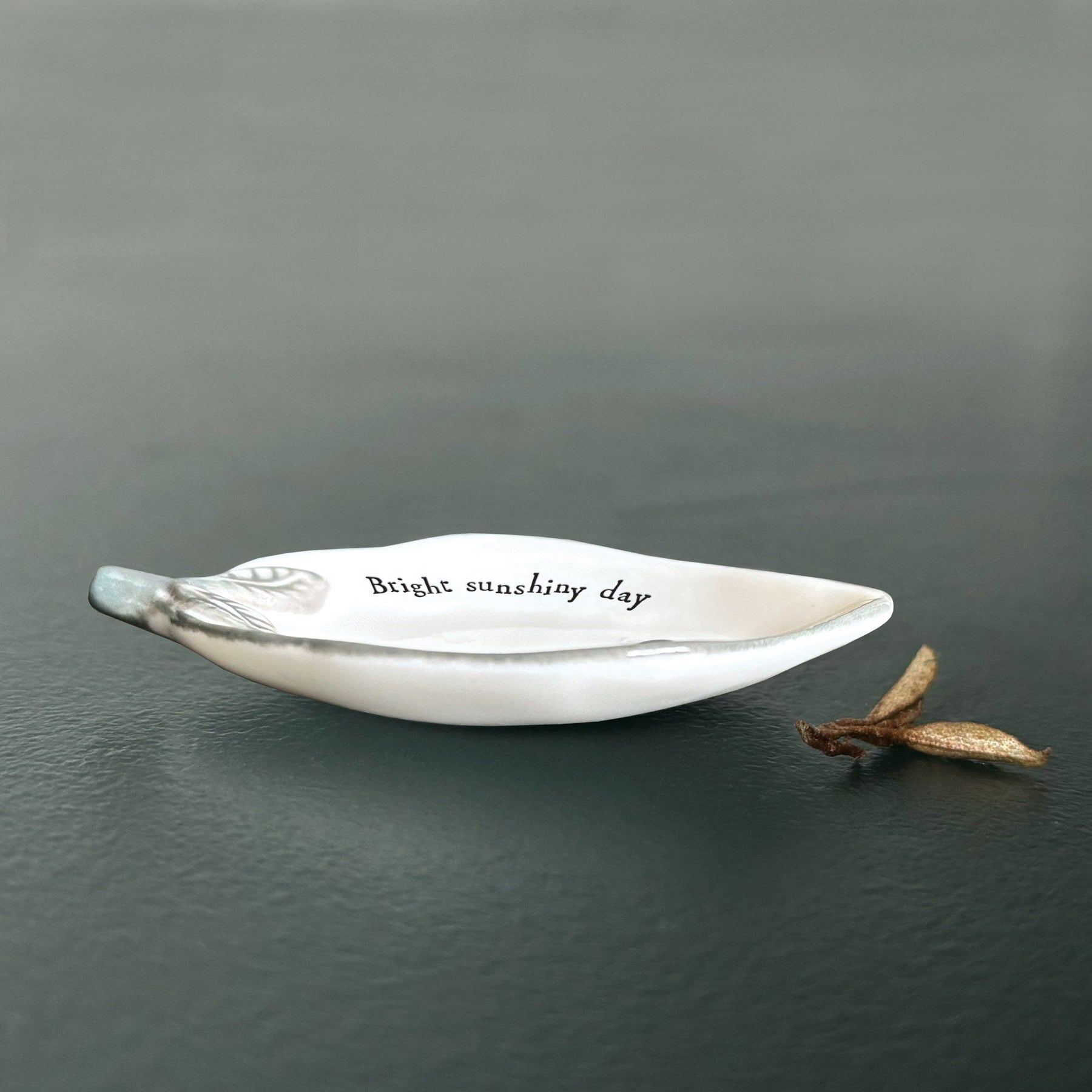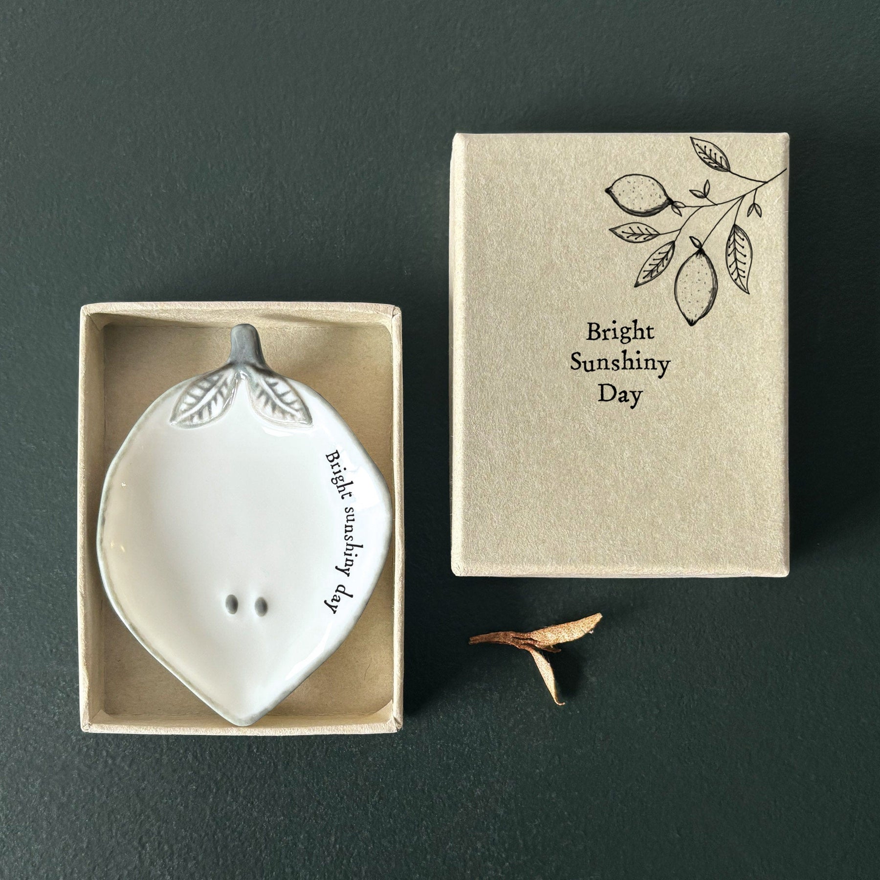 Shaped like a lemon and finished with delicate leaf detailing, it features the phrase “Bright sunshiny day” and comes beautifully presented in a matching gift box.