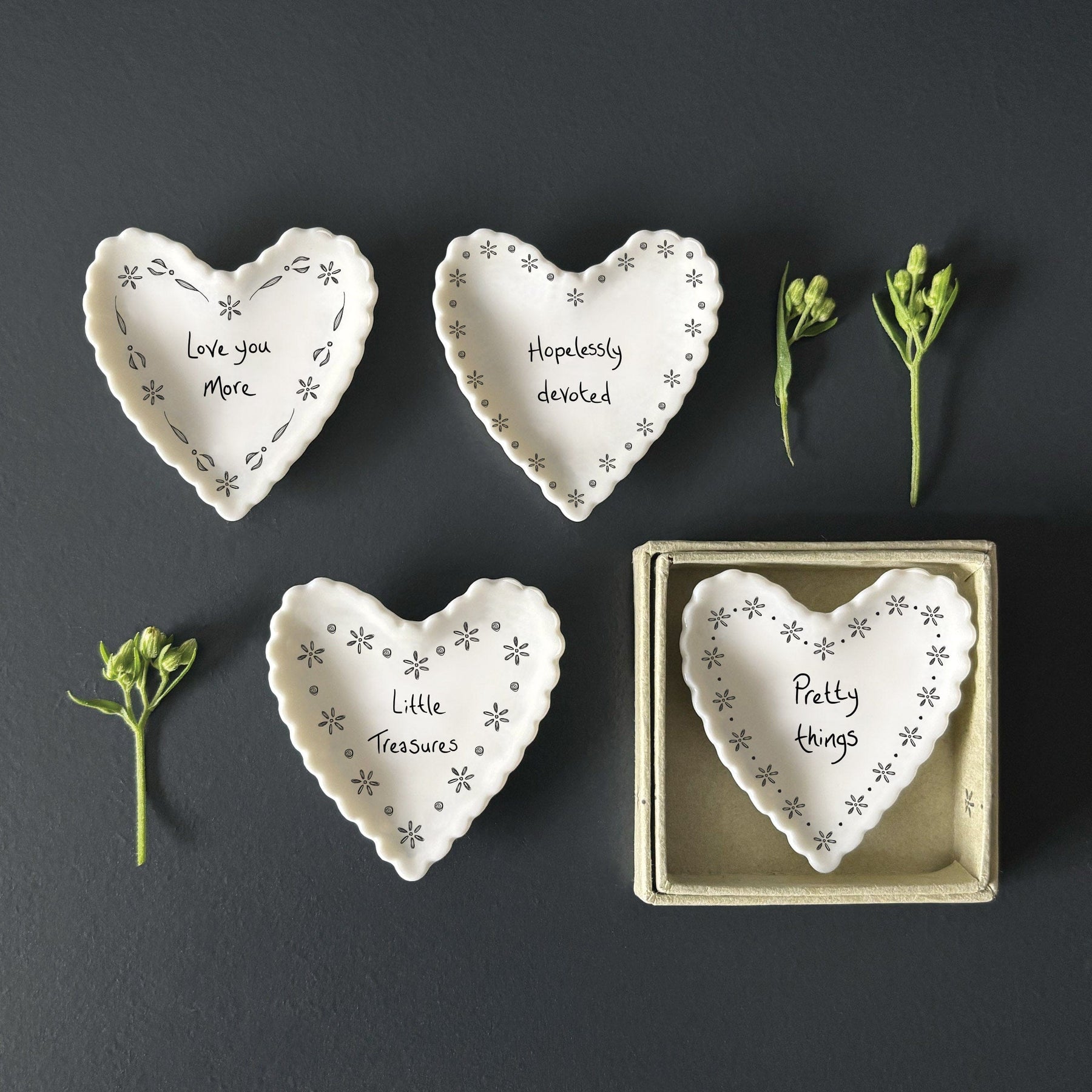 This small East of India scallop heart dish features the handwritten message “Pretty things” finished with delicate hand-drawn details and a softly scalloped edge.