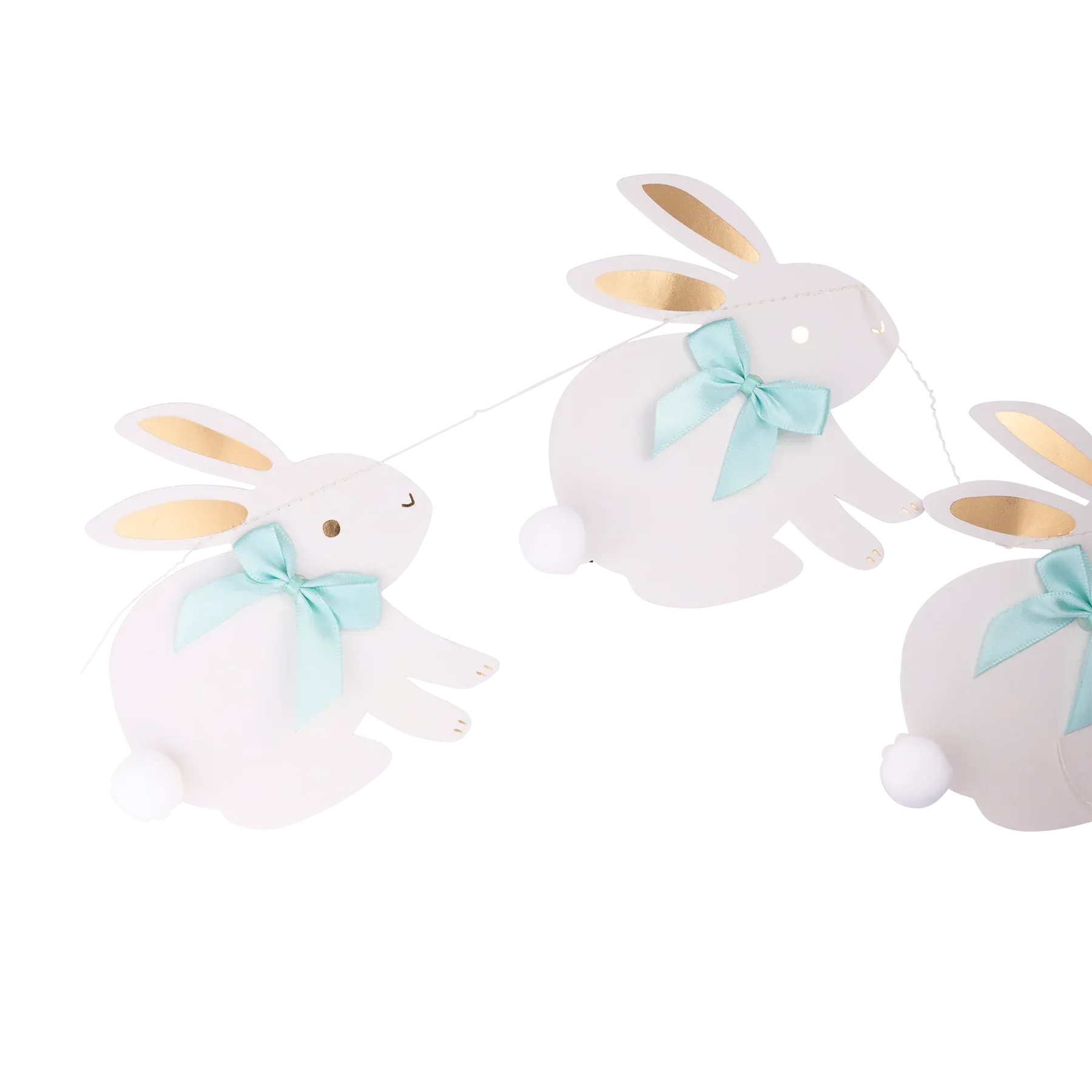 Featuring adorable bunny shapes finished with ribbon bows, pom pom details and gold foil accents, it’s perfect for Easter decorating, spring parties or adding a cheerful feel to shelves, mantels and walls.