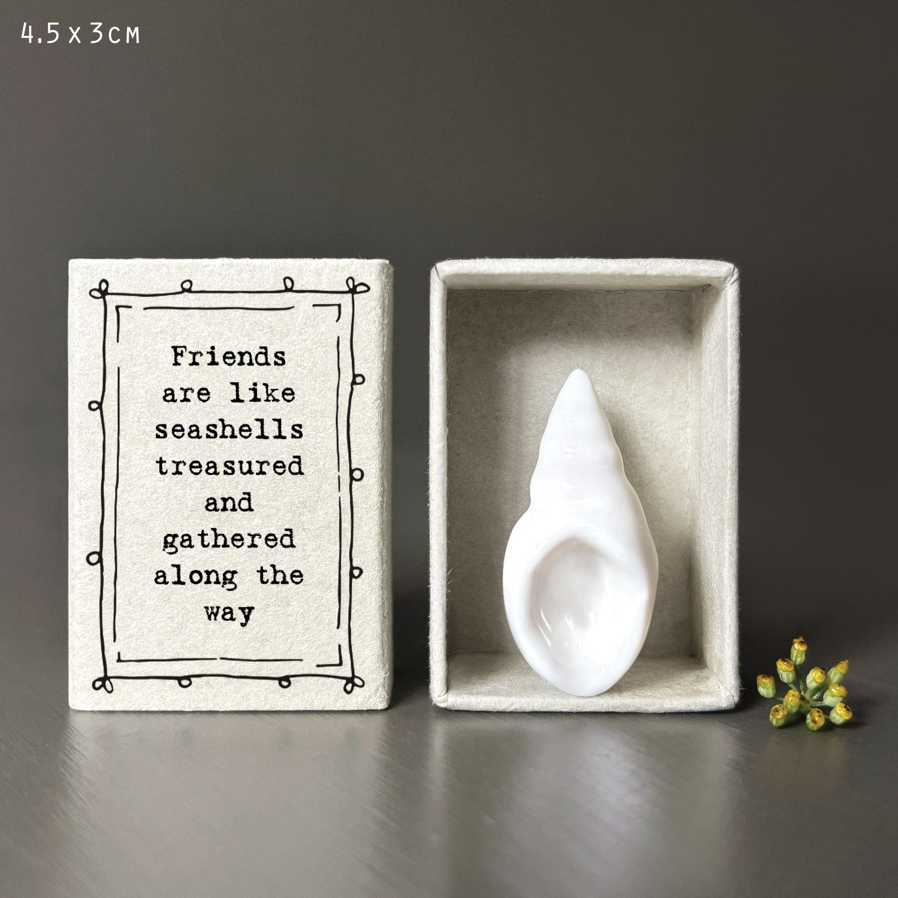 Nestled inside a soft cardboard matchbox with a heartfelt message “Friends are like seashells treasured and gathered along the way”