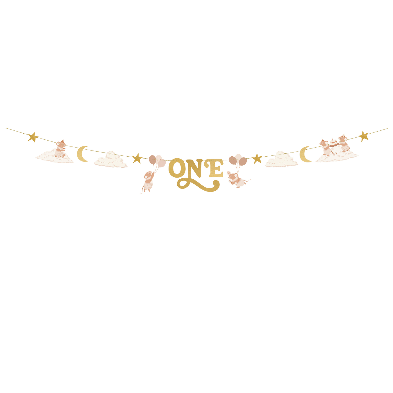 Featuring sweet illustrated mice floating on clouds and carrying balloons, interspersed with gold glitter stars, crescent moons, and a charming gold foil "ONE" centrepiece that catches the light beautifully.