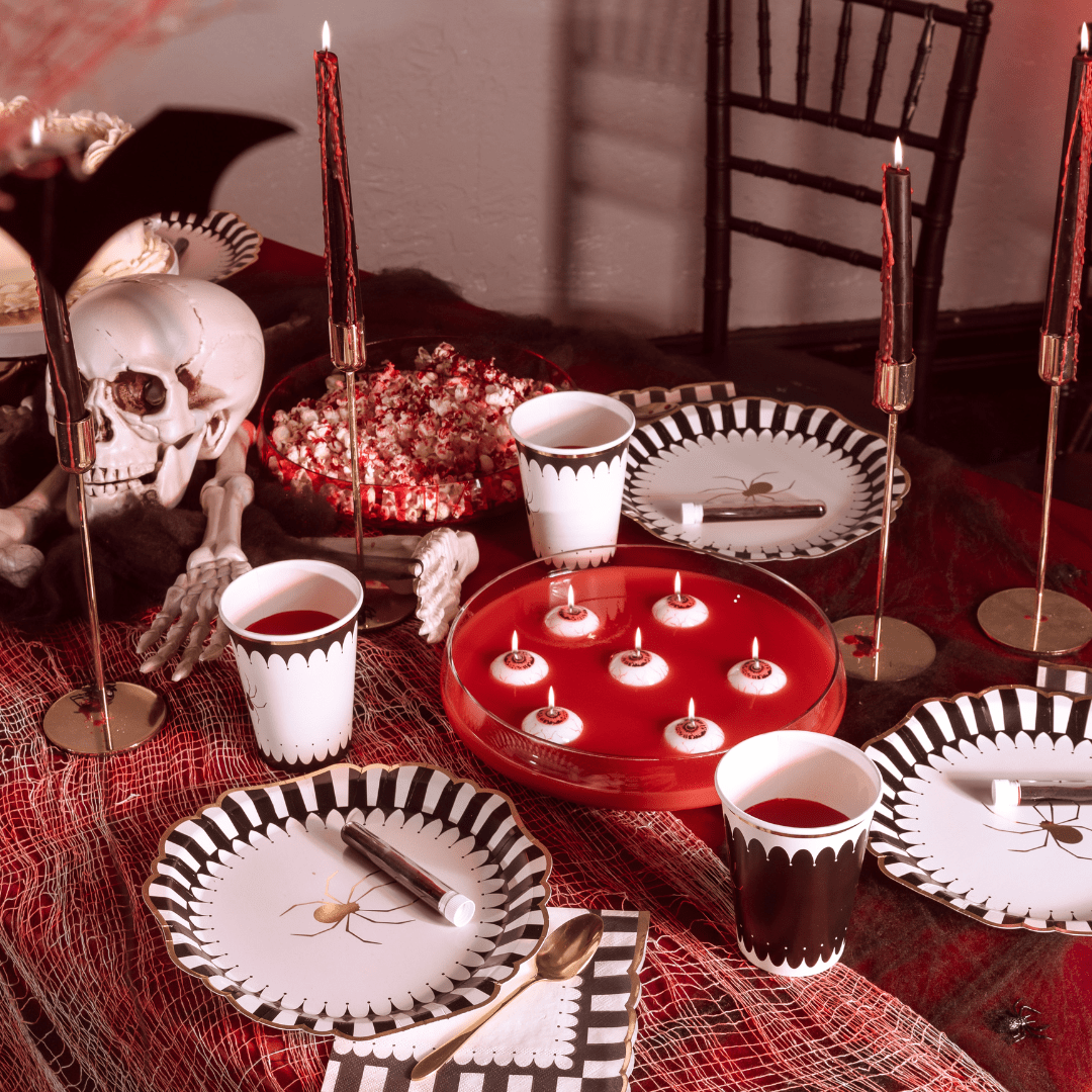 Featuring a dramatic ruffle edge, gold trim and vintage circus-style design, they’re perfect for spooky dessert tables, moody dinner parties or stylish Halloween setups.