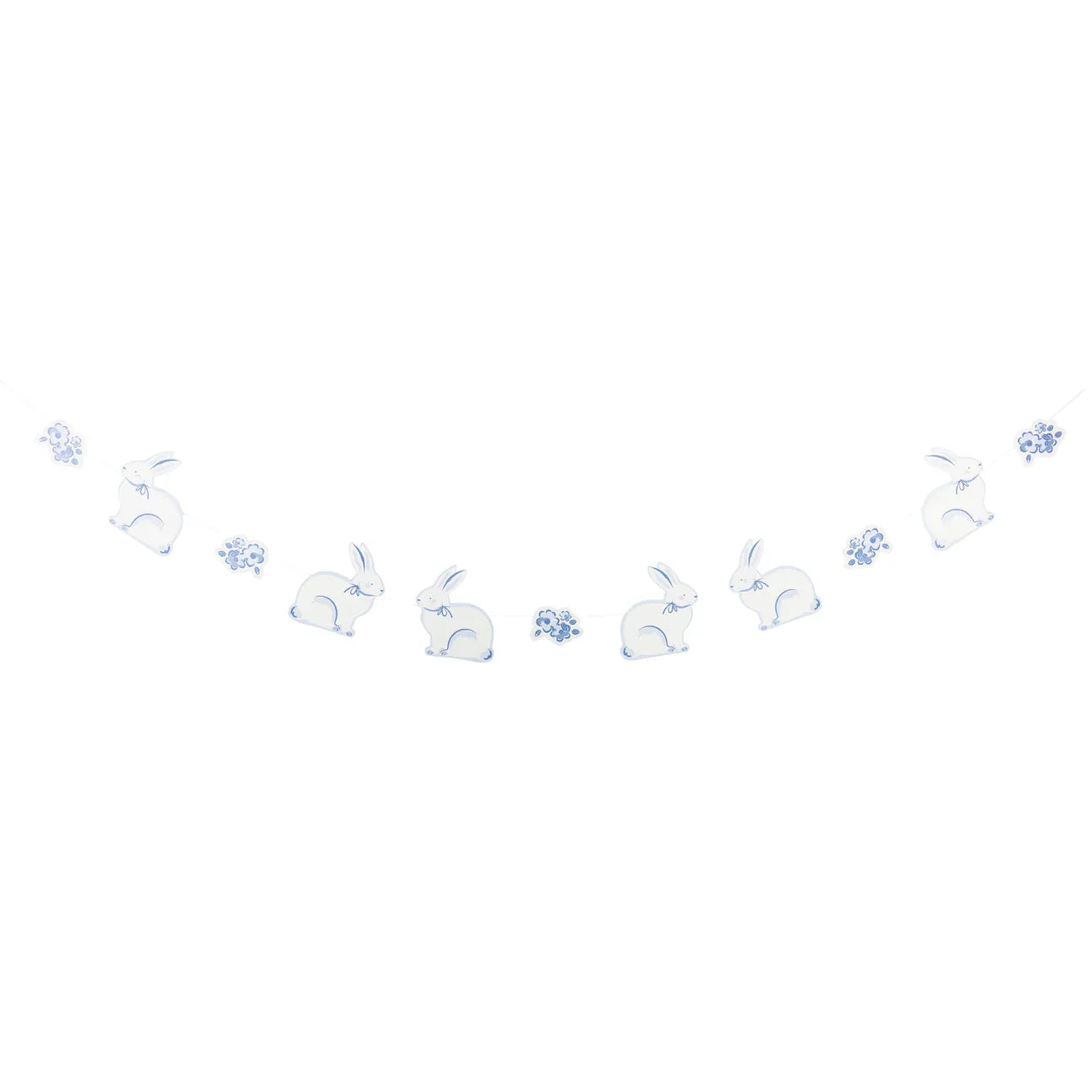 The garland features six sweet bunnies illustrated in soft blue watercolour tones, interspersed with delicate floral clusters along a 6 foot length.