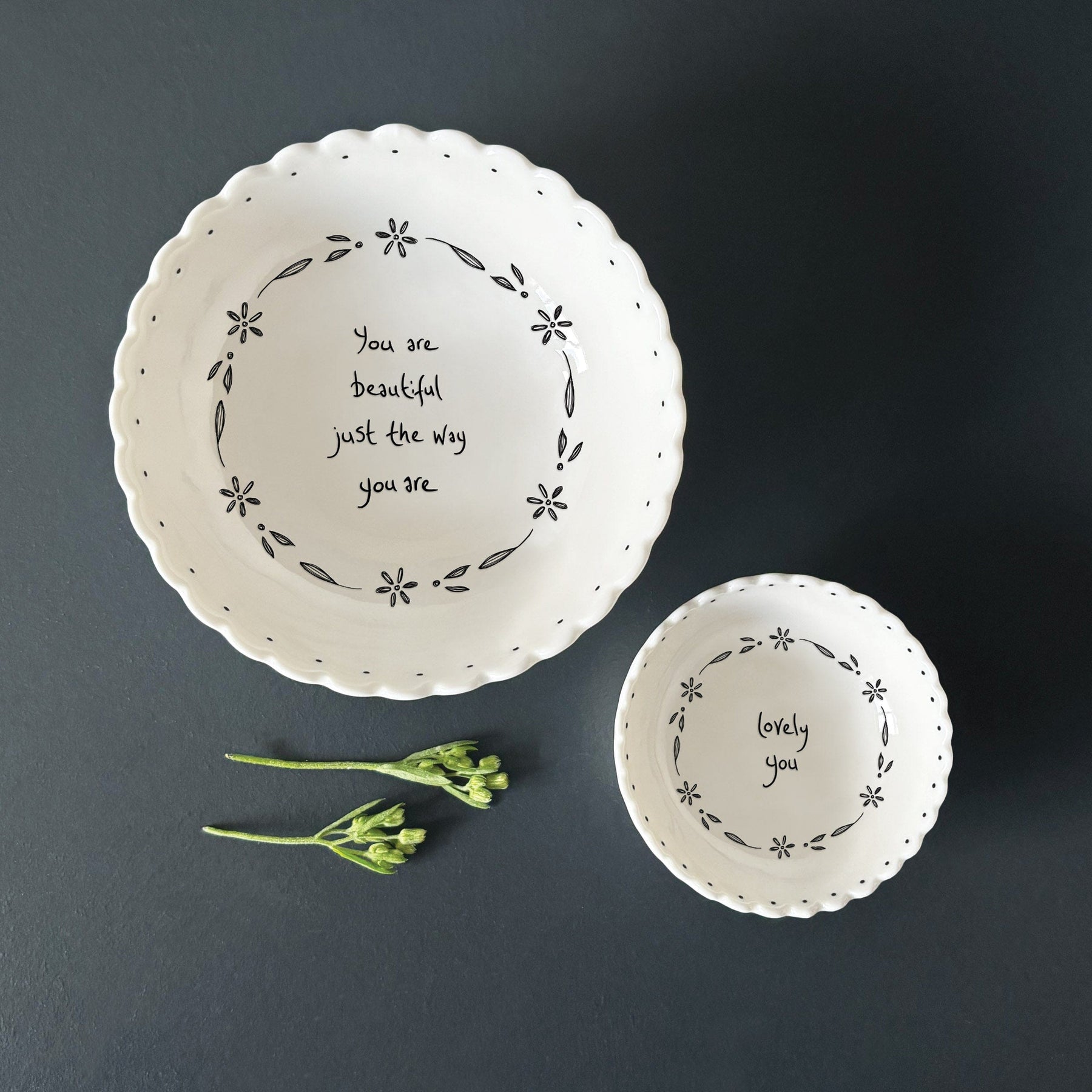 This scallop-edged round bowl from East of India features the message “You are beautiful just the way you are” making it a thoughtful piece designed for everyday use and meaningful gifting.