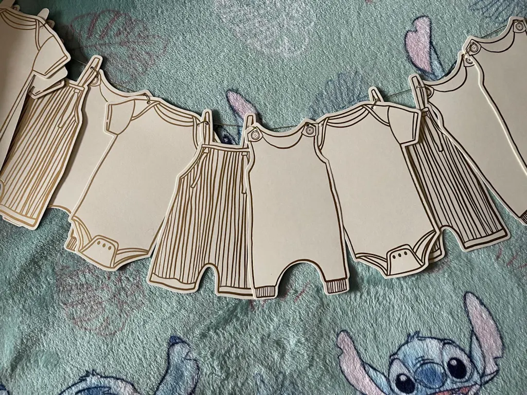 This charming 2.5 metre gold baby grow garland features adorable baby grow card cutouts in metallic gold hues, perfect for celebrating the arrival of a little one or a baby shower.