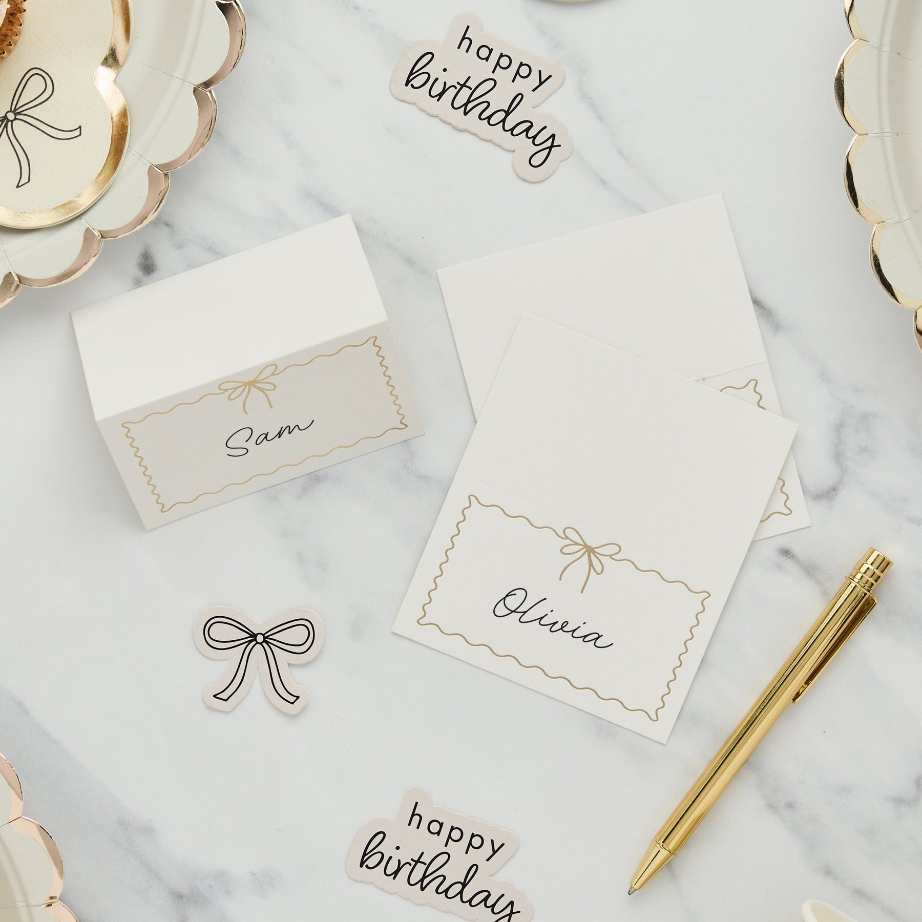 These white and gold wavy edge place cards bring refined detail to your party table.